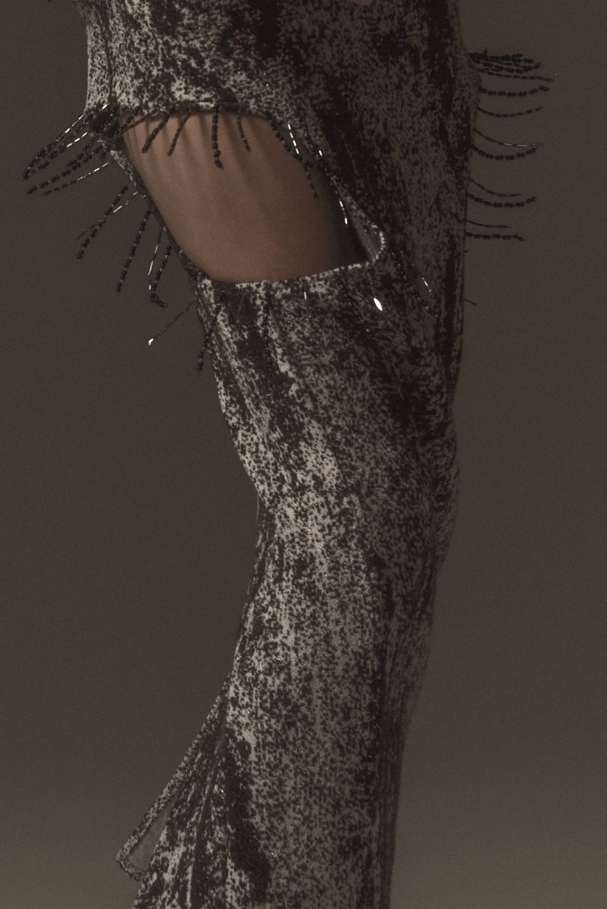 SMOKE is a collection built on transition and craft. It explores how materials can shift and merge, using a fusion of beading techniques and knitted textures to create fluid movement across the line. Each piece contributes to a larger narrative of metamorphosis, capturing the balance between light and shadow, strength and delicacy. Strategic cutouts and fringed detailing emphasize tension as much as harmony, underscoring the collection’s quiet boldness.